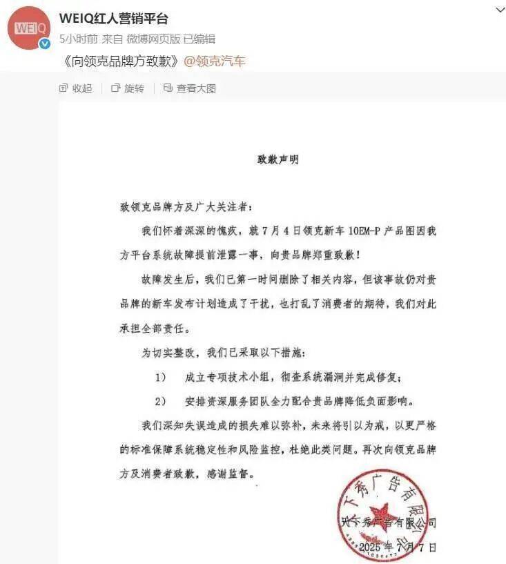 此外,作为一家以技术平台为核心的企业,其运营系统的可靠性也面临挑战。2025年7月,天下秀的客户领克10EM-P宣传素材被提前泄露,天下秀公开致歉,称是旗下红人营销平台WEIQ系统故障导致。暴露出其在技术风险管控上的不足。